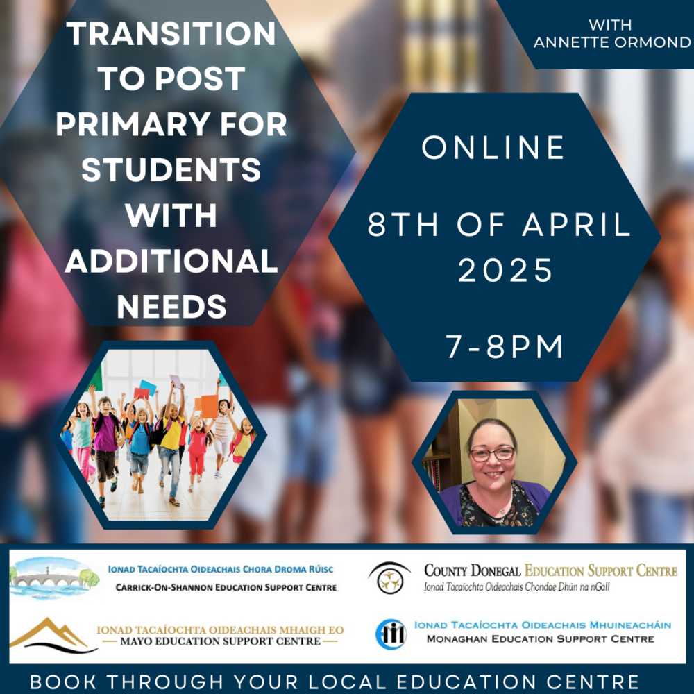 We will explore the difficulties and challenges the transition to Post Primary school may bring for students with additional needs and will look at strategies that may help ease this transition. We will also examine resources available to assist with the transition.