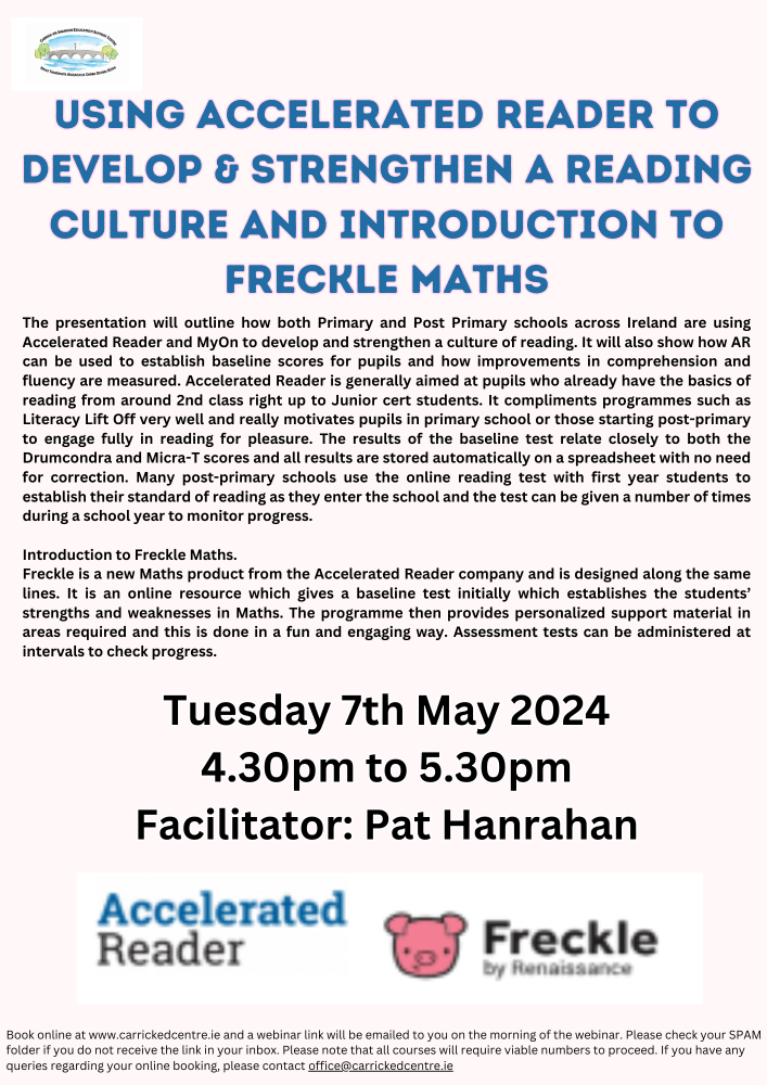 The presenter, Pat Hanrahan, has used Accelerated Reader over many years in his own school and will outline how it is set up and its benefits. He will also answer any questions from Principals or teachers about the resource. If schools are interested in having a closer look at Freckle Maths, Pat will facilitate a further input from established users.